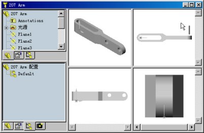 2.窗口的分割:雙擊或拖動窗口分欄線,可以將同一窗口進(jìn)行分割,以便于在不同的窗口中觀看模型的不同視圖。對左側(cè)窗口進(jìn)行分割可以同時(shí)顯示不同的內(nèi)容,如FeatureManager設(shè)計(jì)樹、PropertyManager屬性管理器或ConfigurationManager配置管理器,如圖1所示;